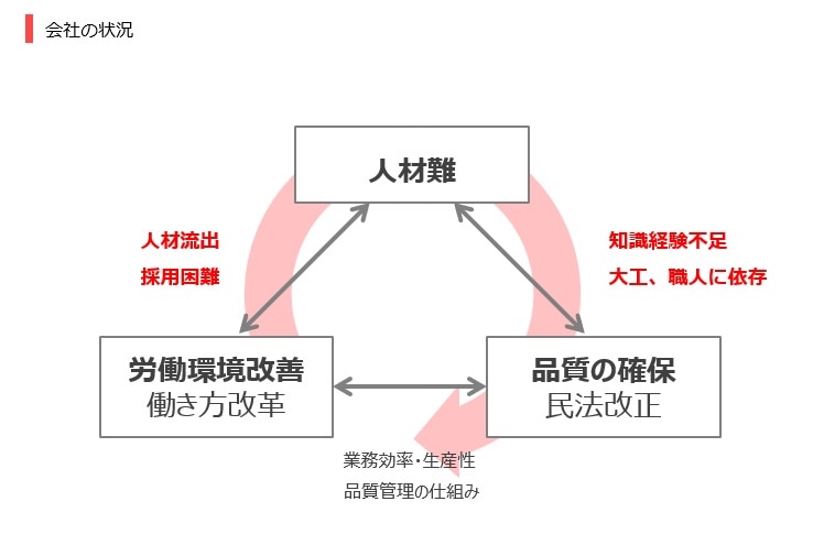 業務効率化・生産性向上・品質管理の仕組み構築など、会社としてやらなければいけないことはたくさんありますが新しい現場監督が決まらず、また他2名の現場監督も担当現場が忙しいため、Aさんに親身になって現場で教育をすることが難しい状況にありました。