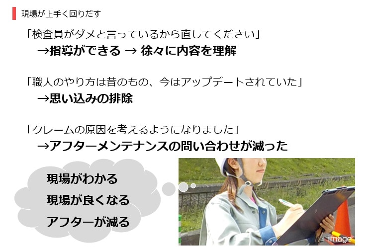 施工基準書と照らしてみると職人が行っている施工法は古い認識のままだった。いまではアップデートされている箇所もあり、検査員とのコミュニケーションも役立っています。自分では見落としていた不具合を拾えるようになり、アフター(やり直し)の費用が減ったことを実感しています。