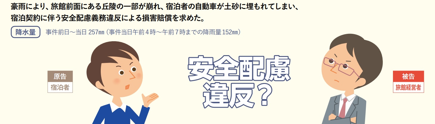 豪雨に見舞われた結果の土砂災害事故の法的責任については過去の判例があり、これらの知識を持った上で対応する事が大切です。