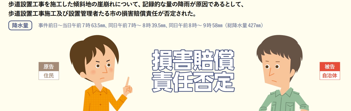 崖崩れは、記録的な量の降雨を原因として発生したものといわざるを得ず、工事によって敷設された歩道の設置管理に瑕疵があったとは認められない。