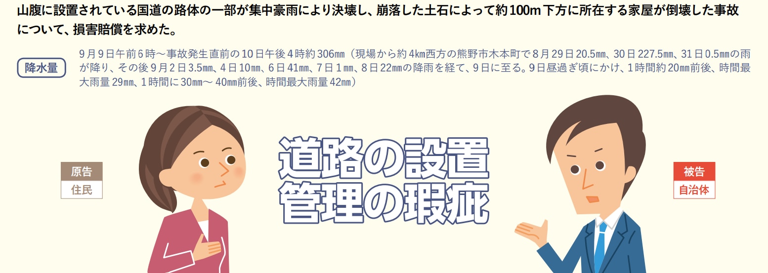 自宅裏の崖が土砂崩れを起こし、それに巻き込まれて亡くなった方のご遺族らが、死亡は被告町及び被告道が同崖に施した工事による営造物の設置又は管理に瑕疵があったためであり、仮にこれが認められないとしても、町には避難勧告義務違反があり、同崖に防災工事等を施す等の作為義務に違反したとして、被告らに対し家賠償法に基づく損害賠償を求めた事案
