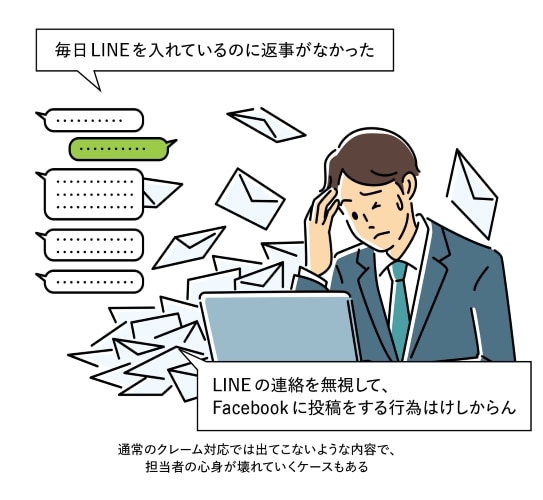 また、顧客からのクレームをLINEで受け付けていると、昼夜を問わず連絡が入り、すぐに返事をしないと怒りのメッセージが届く、といった事態にもなりかねません。