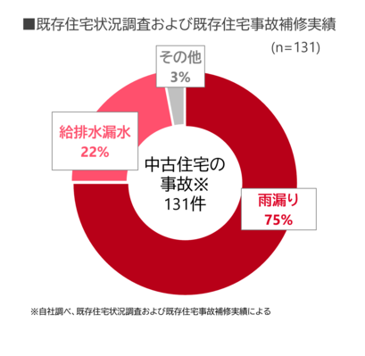 給排水管のトラブルは、既存住宅において実際に発生しやすいリスクの一つです。実際にJHS調べでは、中古住宅の事故の内訳として、給排水管の事故は2番目に多い22%を占めています。配管の経年劣化による漏水や、接合部の破損などは、目に見えにくい部分だからこそ、劣化状況を把握しづらいからと考えられるでしょう。