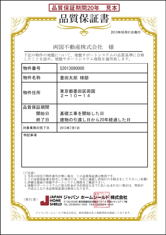 A. | 建物が不同沈下しない地盤の解析品質を保証しています。 ※万が一不同沈下が起きてしまった場合は、沈下修正費用(沈下修正工事・沈下による建物の不具合箇所の工事)や再発防止工事費用、必要に応じて仮住まい費用などを補償させていただいております。詳細はこちらよりご確認いただけます。 |