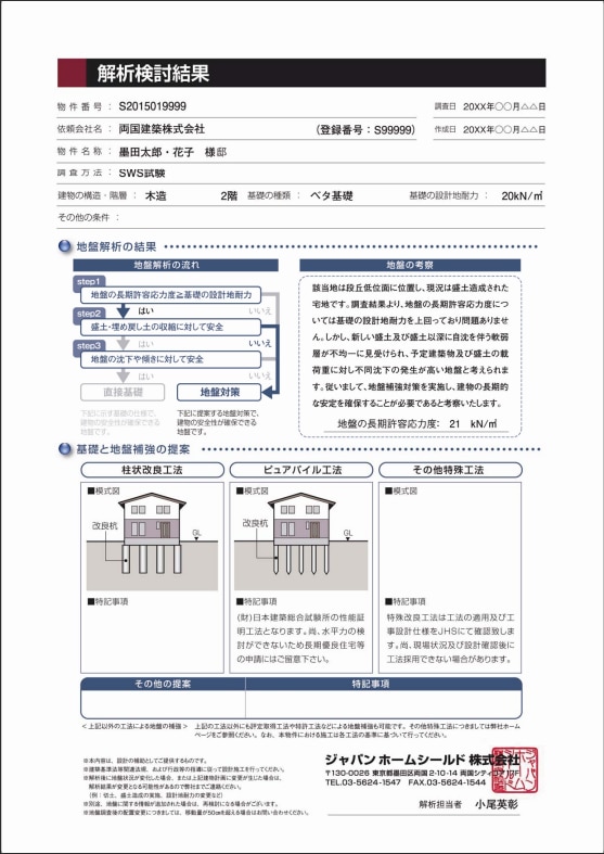 調査データと土地情報を報告書にまとめ、安全面とコスト面で最適な「基礎・対策工法」をご提案いたします。