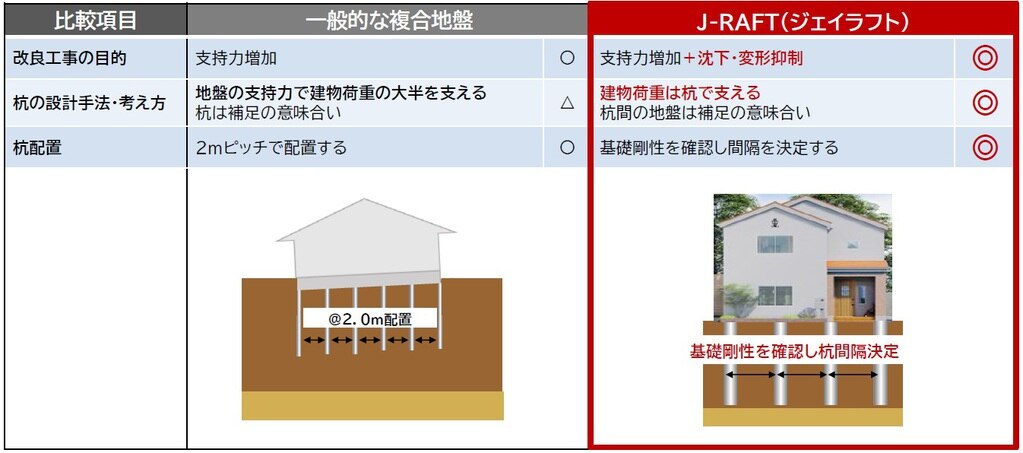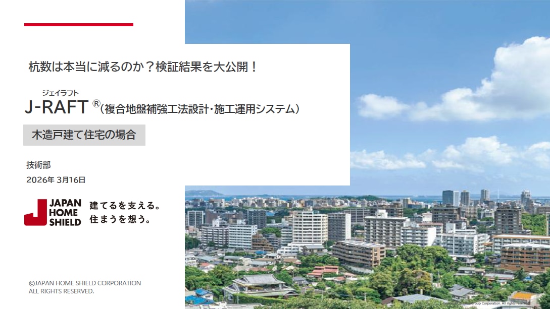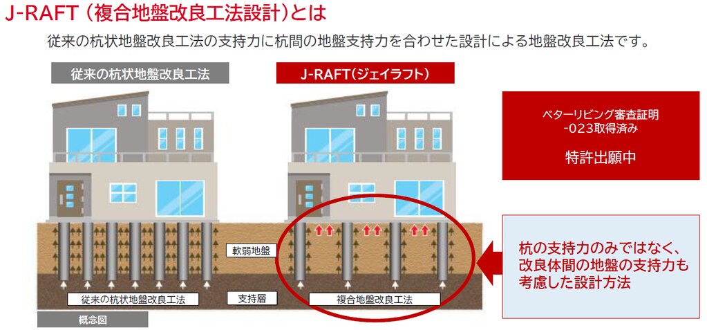 複合地盤補強工法設計・施工運用システム J-RAFT®(ジェイラフトについて、木造戸建て住宅で施工した場合の検証結果をまとめた資料になります。