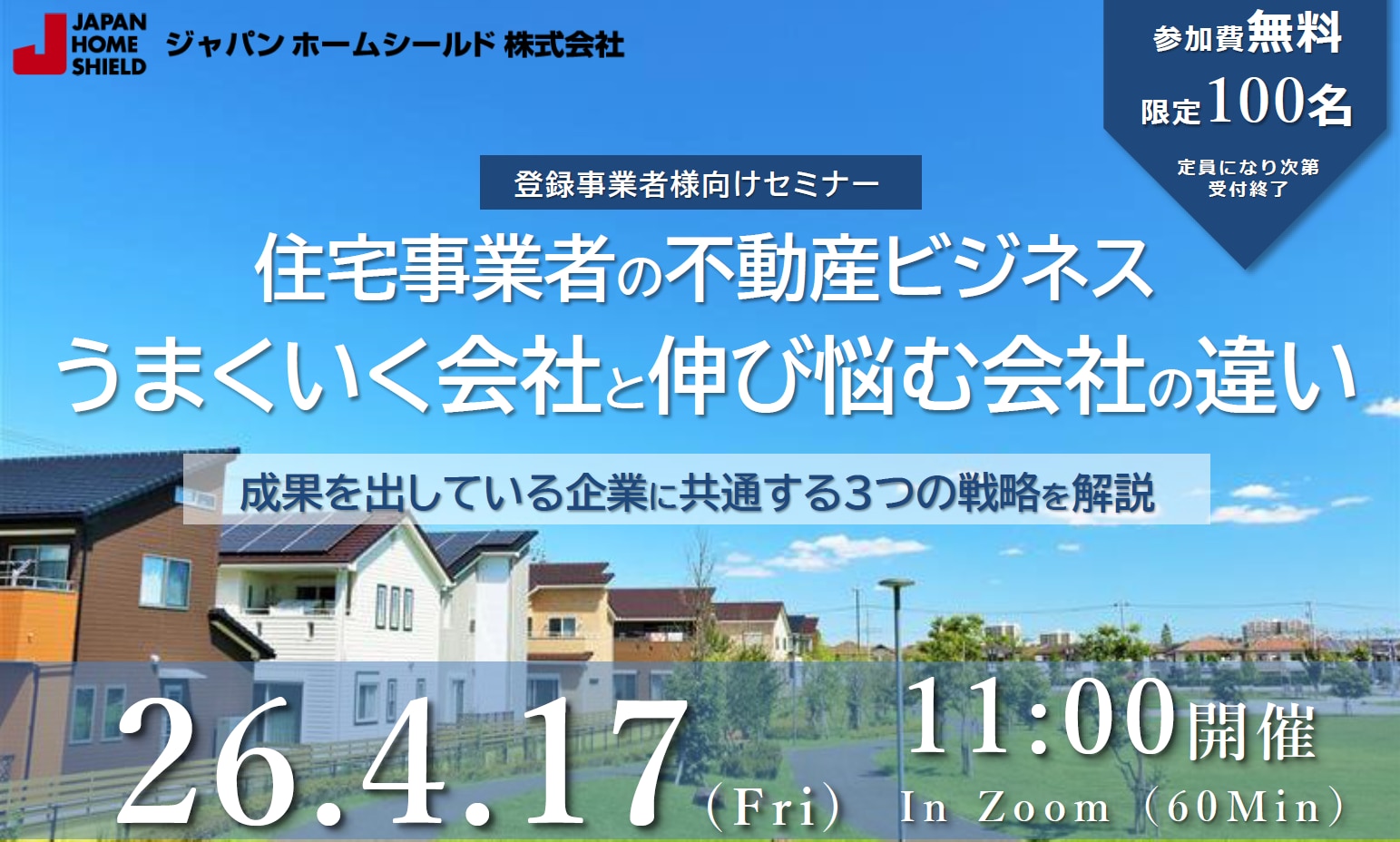 3. ジャパンホームシールド、または登壇企業様の競合にあたる企業にご所属の方は、 ウェビナーへのご参加をお断りさせていただく場合がございます。予め、ご了承ください。 |
